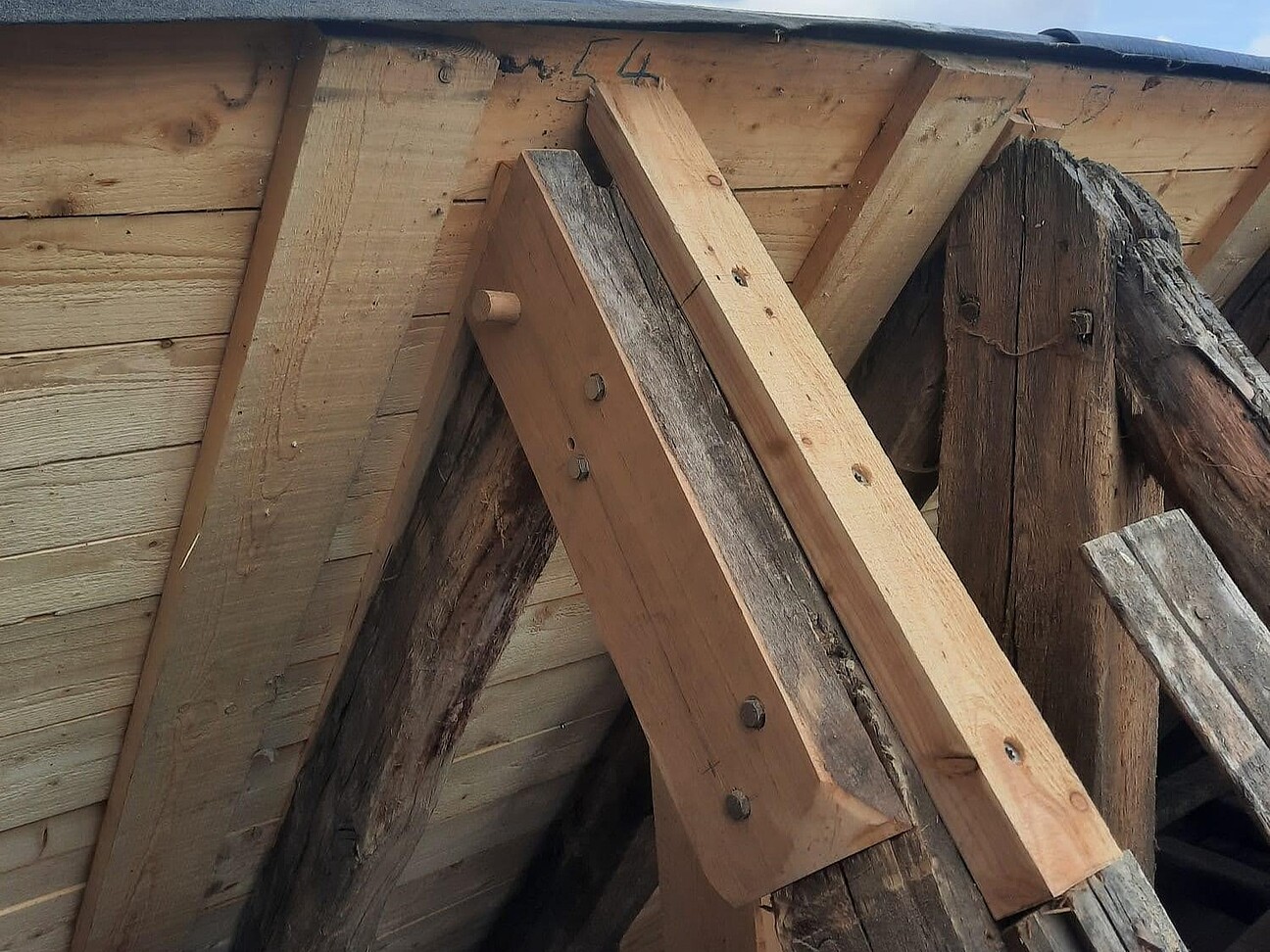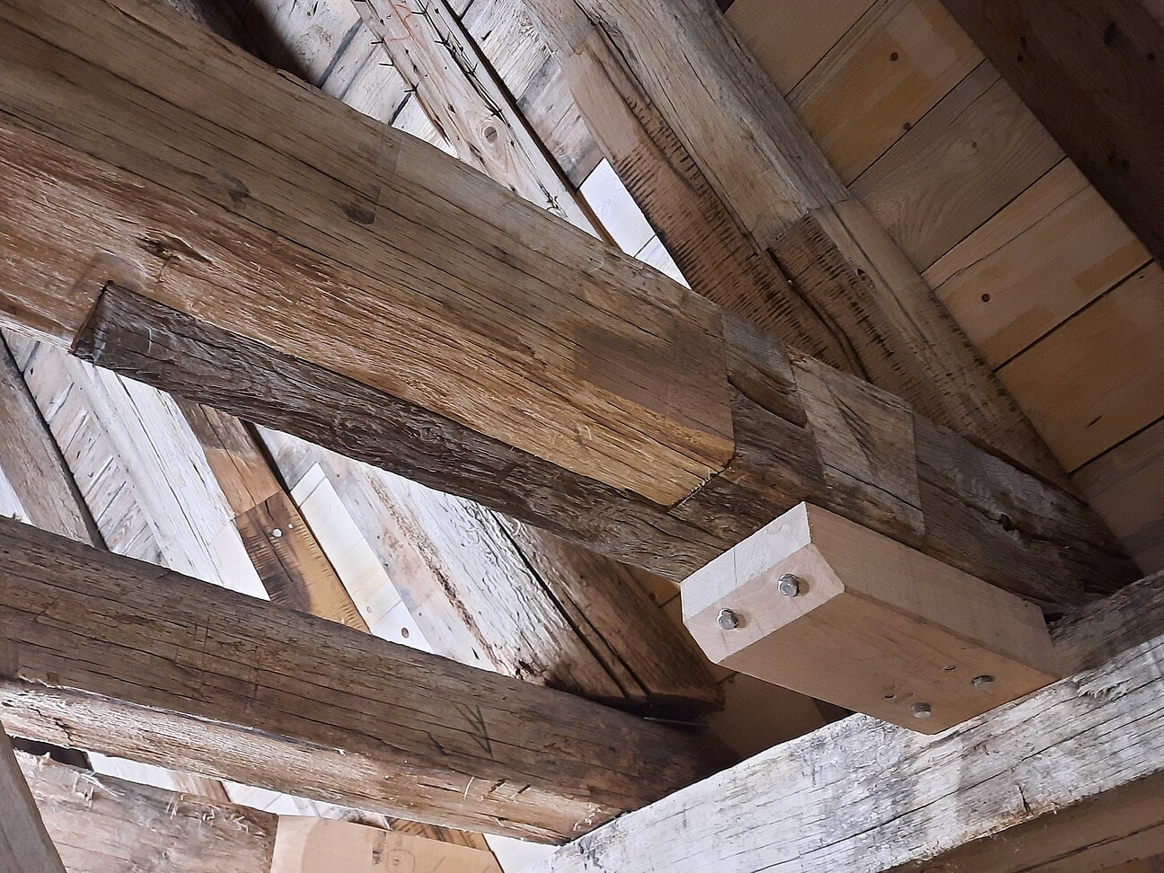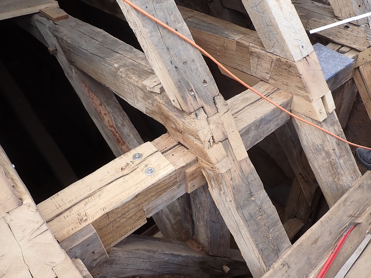 - Instandsetzung aller Dachstuhlkonstruktionshölzern nach Vorgabe des Ingenieurbüros (12 Sparrenachsen am Querhaus, 58 Sparrenachsen am Langhaus); Ausführung von zimmermannsmäßigen Holzverbindungen