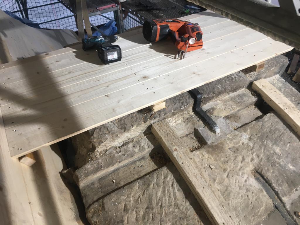 - Montage einer neuen Dachschalung (Rhombusschalung, inkl. Unterkonstruktion); tlw. Ausführung als Rundbogen (Naturwerksteinbögen)