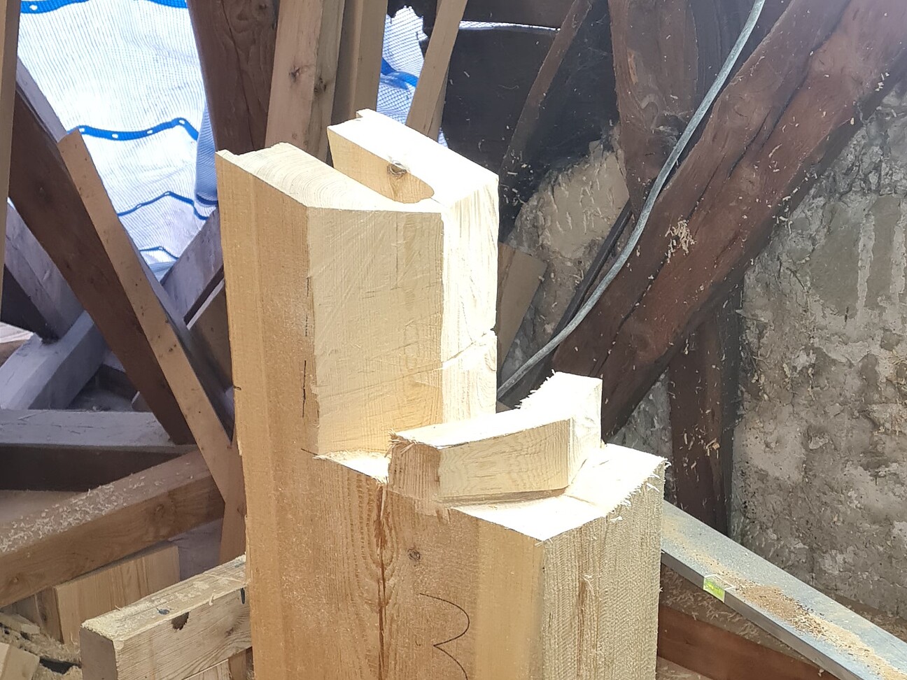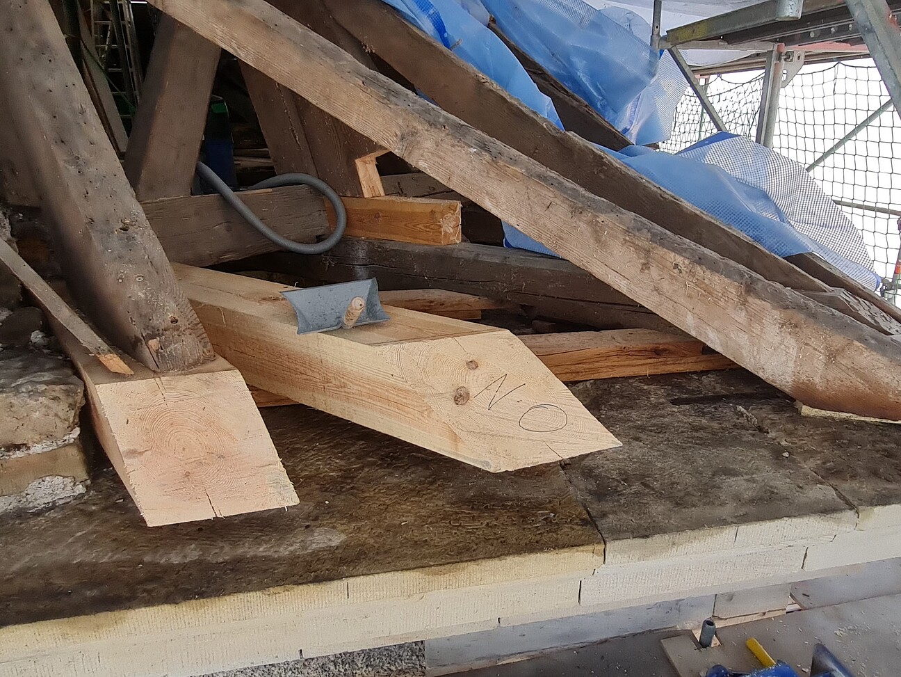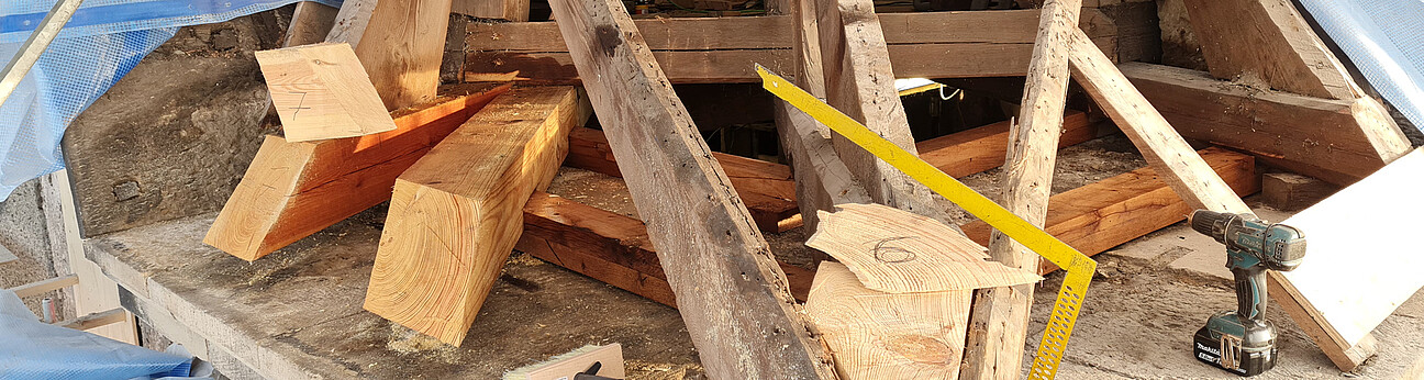 - Aus- und Einbau von versch. Konstruktionshölzern (Holzart: Kiefer) entsprechend der historischen Einbaukonstruktion; Herstellung der originalen Holzverbindungen