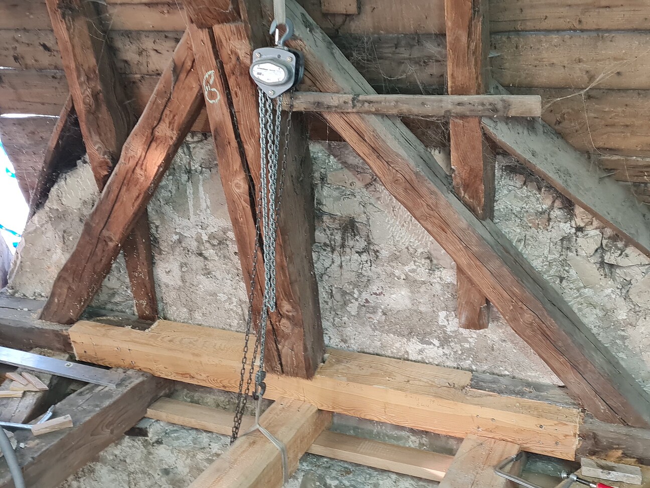 - Einbau neuer Deckenbalken / Sanierung von beschädigten Bestands-Deckenbalken (Holzart: Kiefer)
