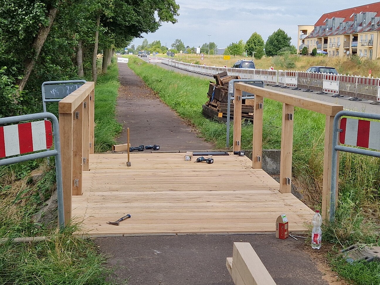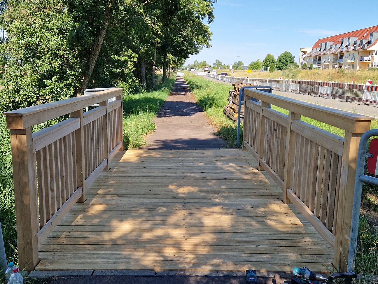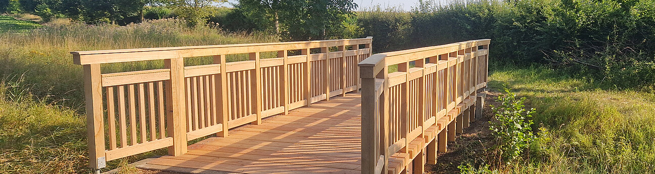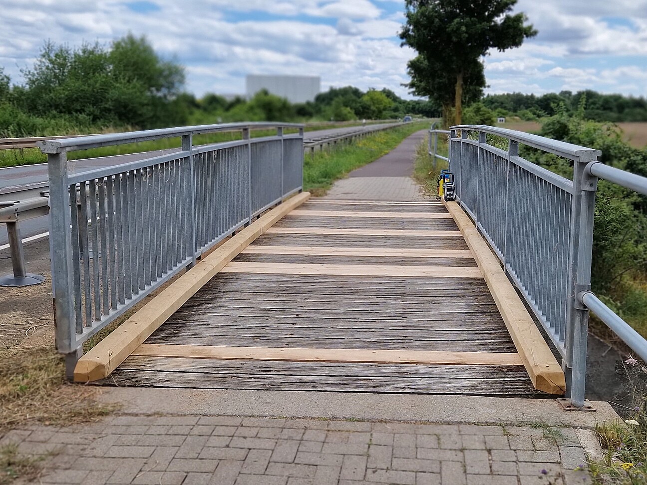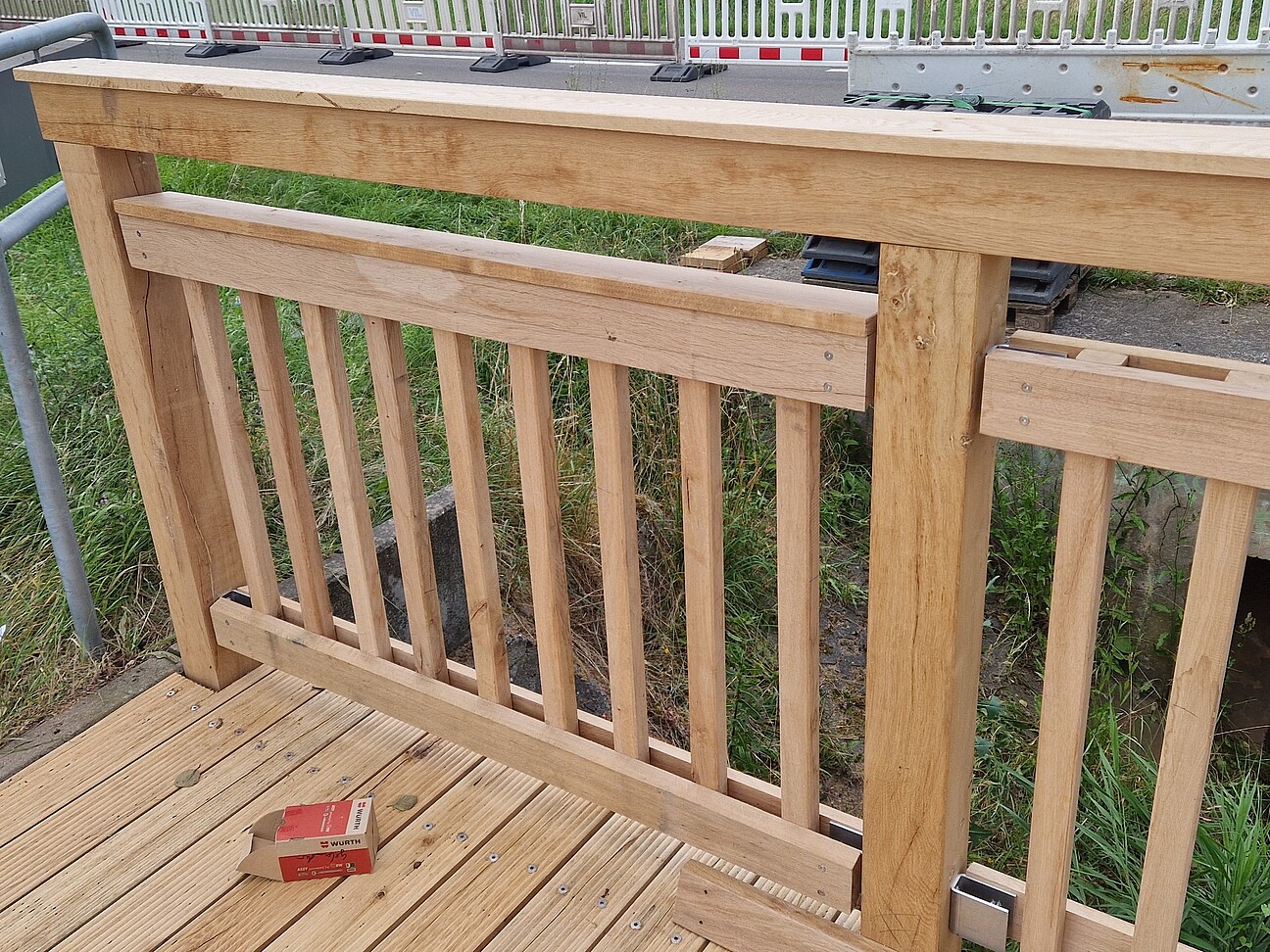 - Herstellung / Einbau neuer Belagsbohlen sowie eines Brückengeländers (Eiche)