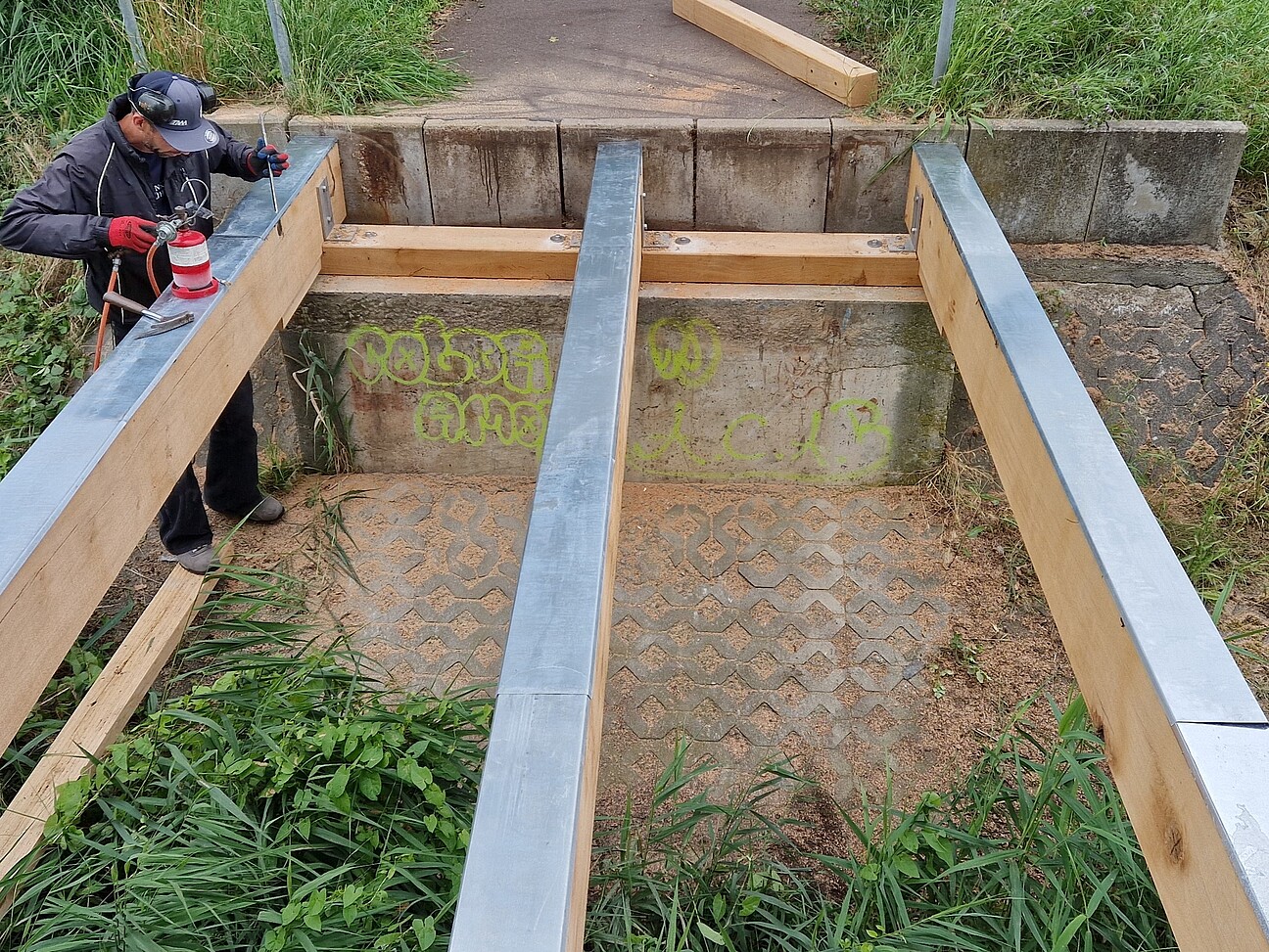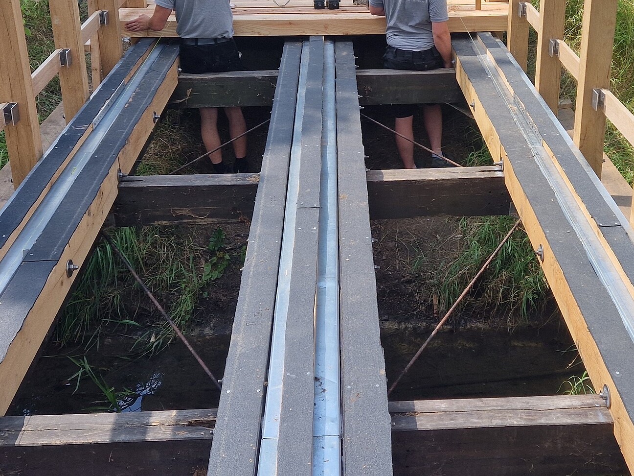 - Rückbau defekter Holzelemente an den Brücken (Geländer, Bohlen, Brückenhauptträgern, Blechabdeckungen)