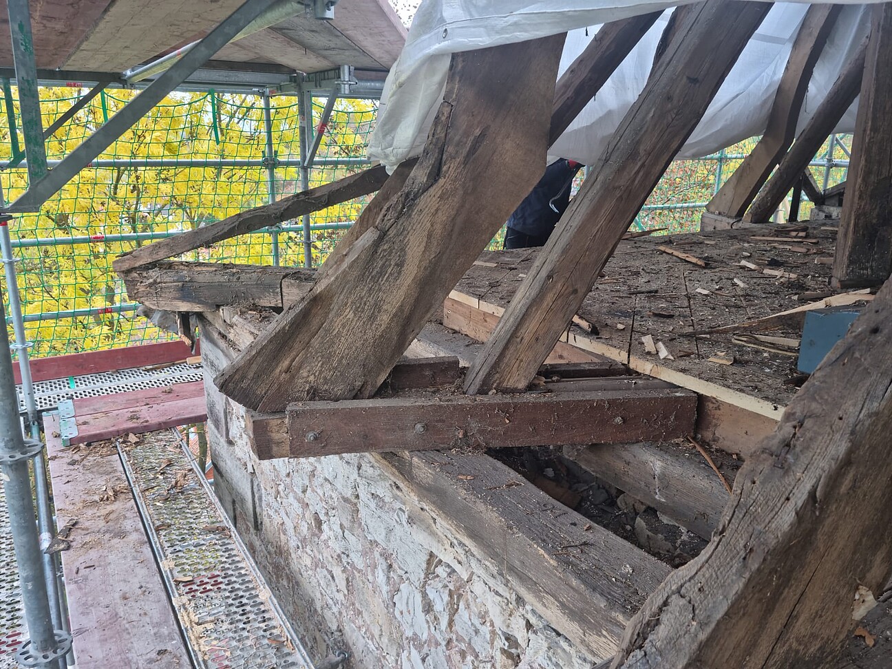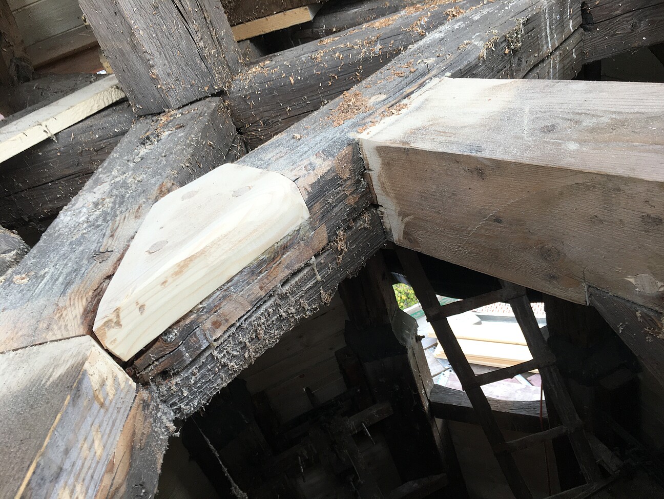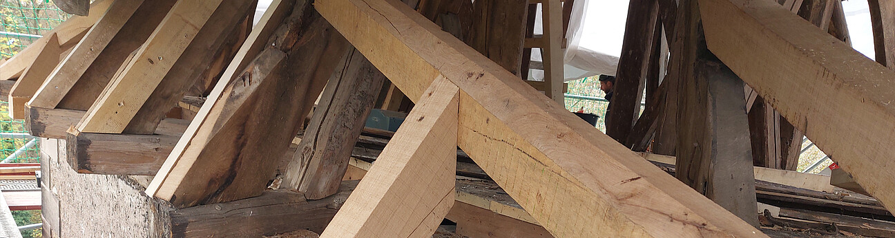 - Rückbau / Gesundschnitt schadhafter Holzbereiche (Mauerschwellen, Decken- und Stichbalken, Aufschieblinge, Streben, Sparren, Stützen, etc.)