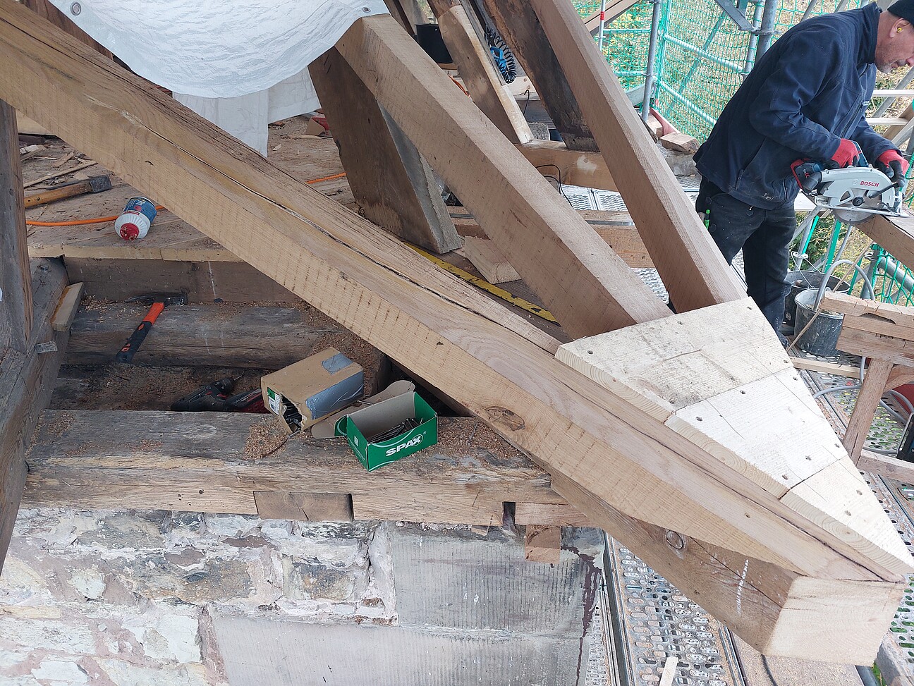 - Lieferung, Zuschnitt und Einbau passgenauer Holzelemente an zuvor gesundgeschnittene Bereiche (Eichenholz, Nadelholz); Herstellung zimmernmannsmäßiger Holzverbindungen
