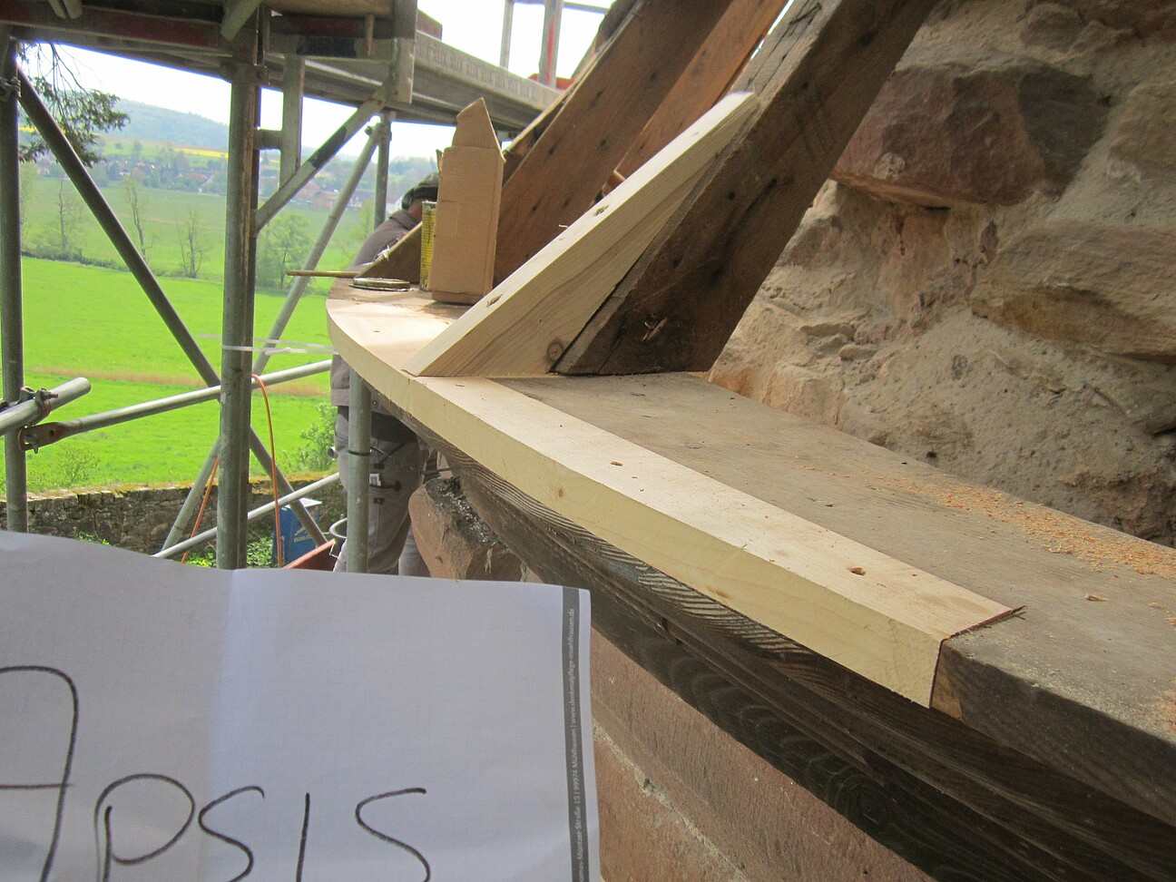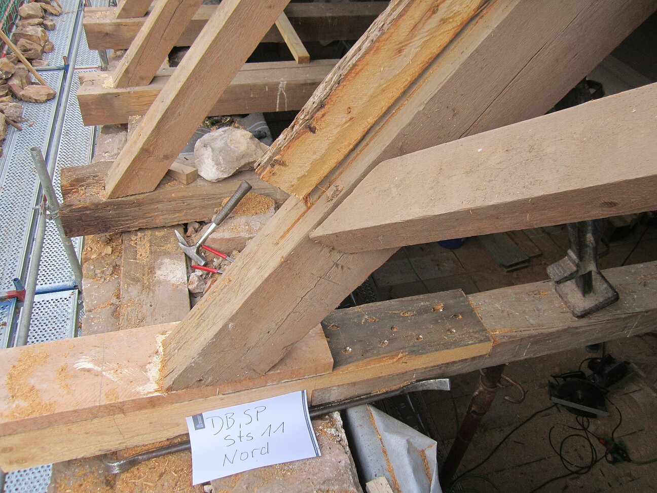 - konstruktive Sparrenverstärkung; Sanierung beschädigter Sparrenfüße, Stuhlsäulen und geschädigter Deckenbalkenköpfe durch Einbau von Passstücken