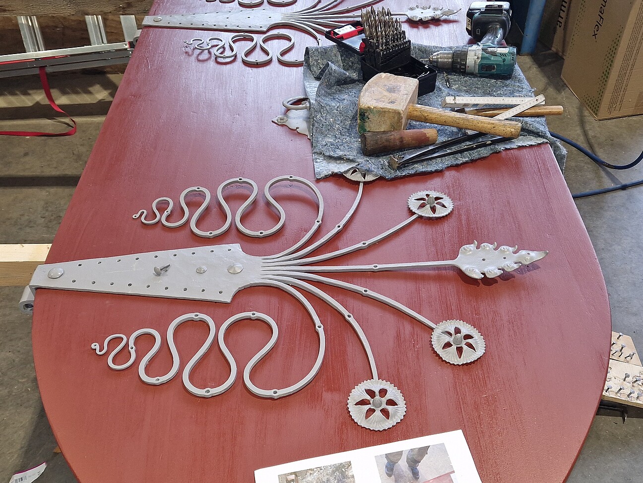 - Ausbau aller Metallelemente (Bänder, Zierwerk, etc.); Abnahme von Beschichtungen und Korrosionsprodukten durch sandstrahlen; Applikation eines Korrosionsschutzsystems; Deckbeschichtung gemäß des historischen Bestands