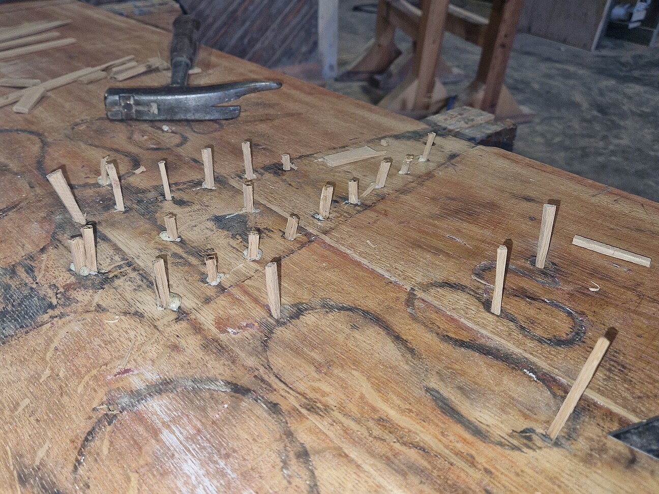 - materialschonenende Abnahme der Farbfassungen (chemisch / mechanisch); Ausbau defekter Holzbereiche; Verschluss aller Fehlstellen (tlw. Vierungen) und Risse