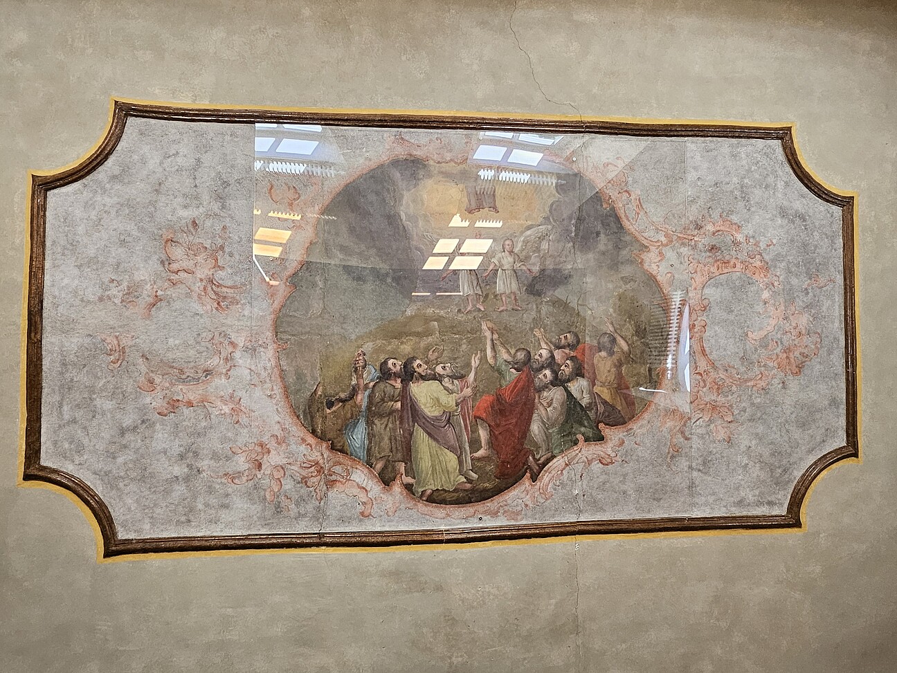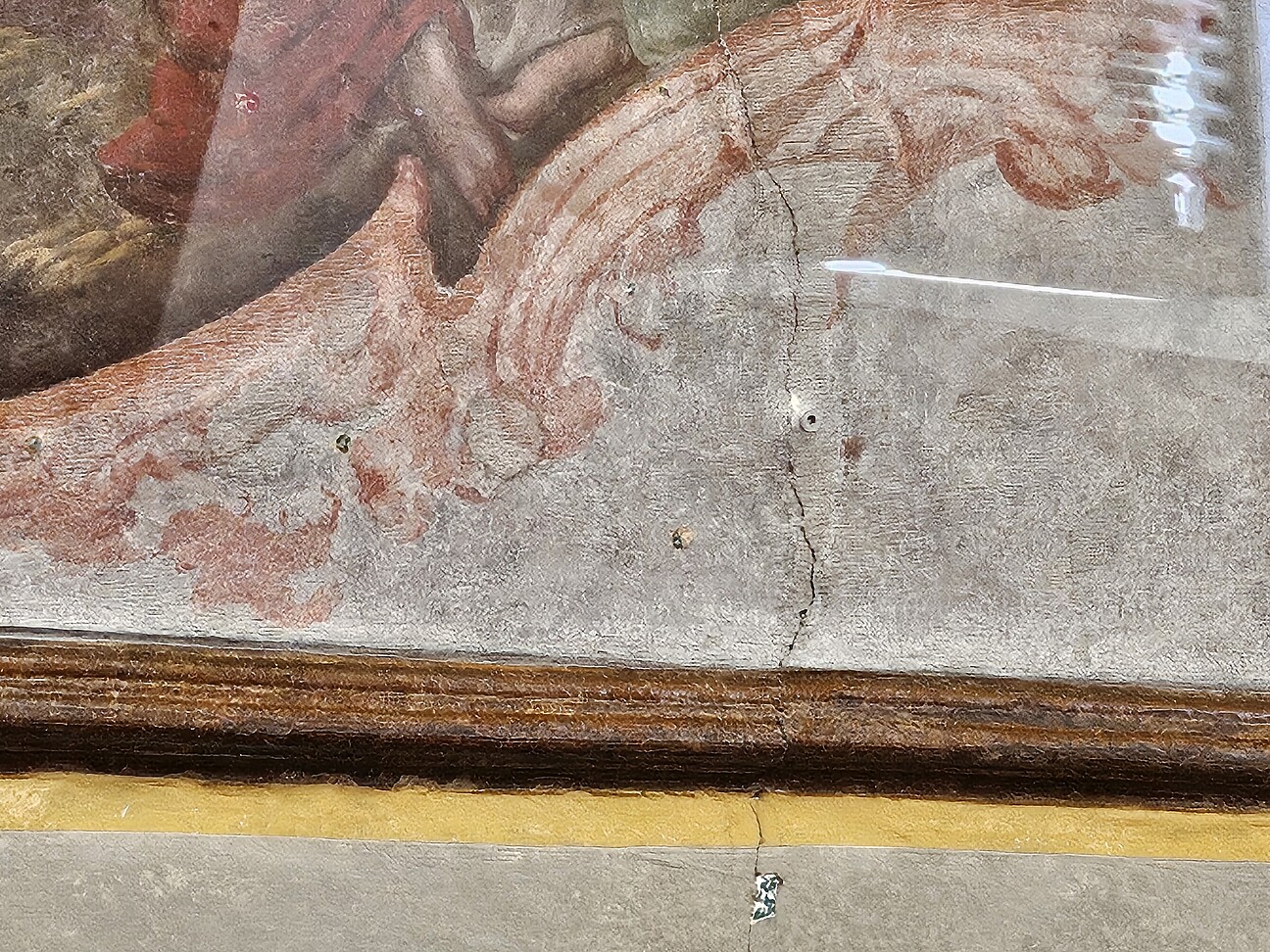 - Vorsetzen einer Glasscheibe vor die abgängigen Bereiche des Bildes (Verankerung in den Deckenbalken / stabilen Putzbereichen)