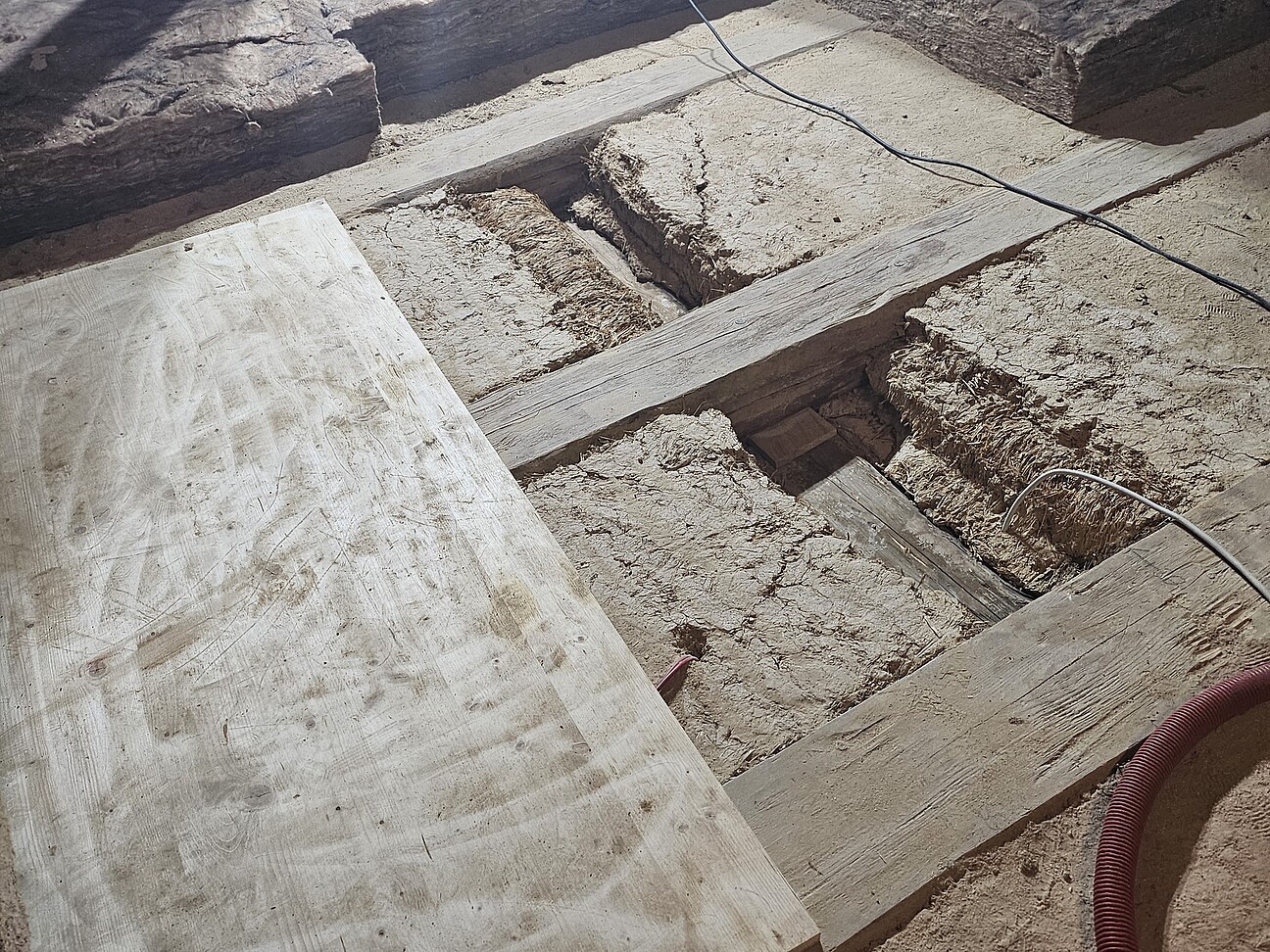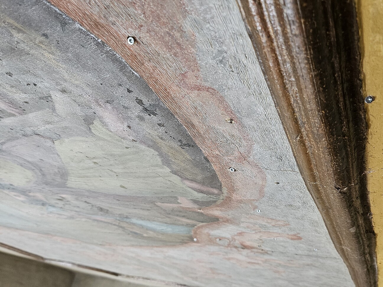 - Untersuchungen zur Schadensursache: Öffnung der Deckenfelder (Fachwerkbau mit Lehmausfüllungen) oberhalb des Gemäldes zur Lokalisation möglicher Bewegungen / Materialablösungen