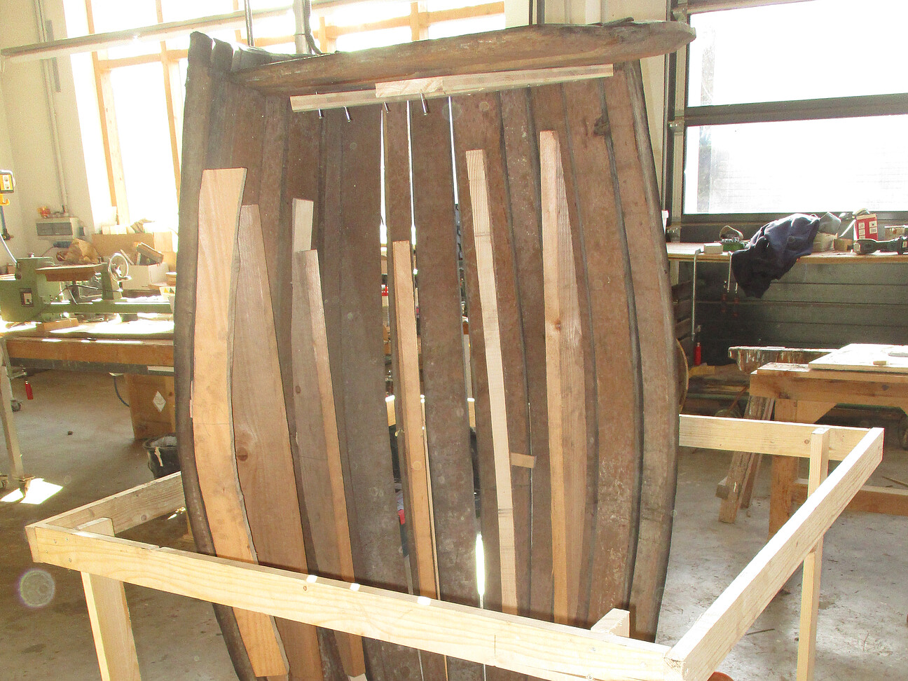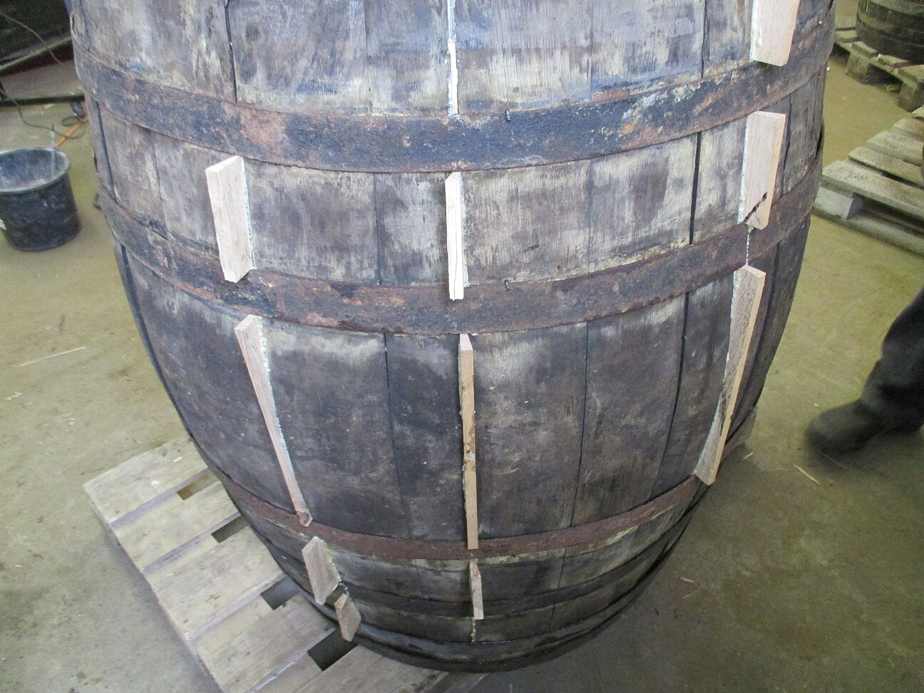 - Austausch stark beschädigter Dauben aus dem Bestand; Verschluss von Spaltöffnungen mit Eichenholz; Ersatz und / oder Neuanfertigung von Zapfen