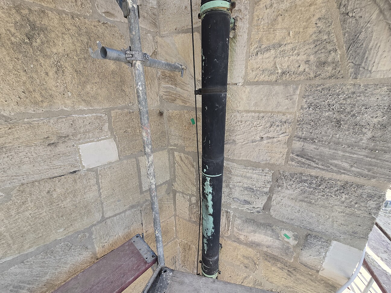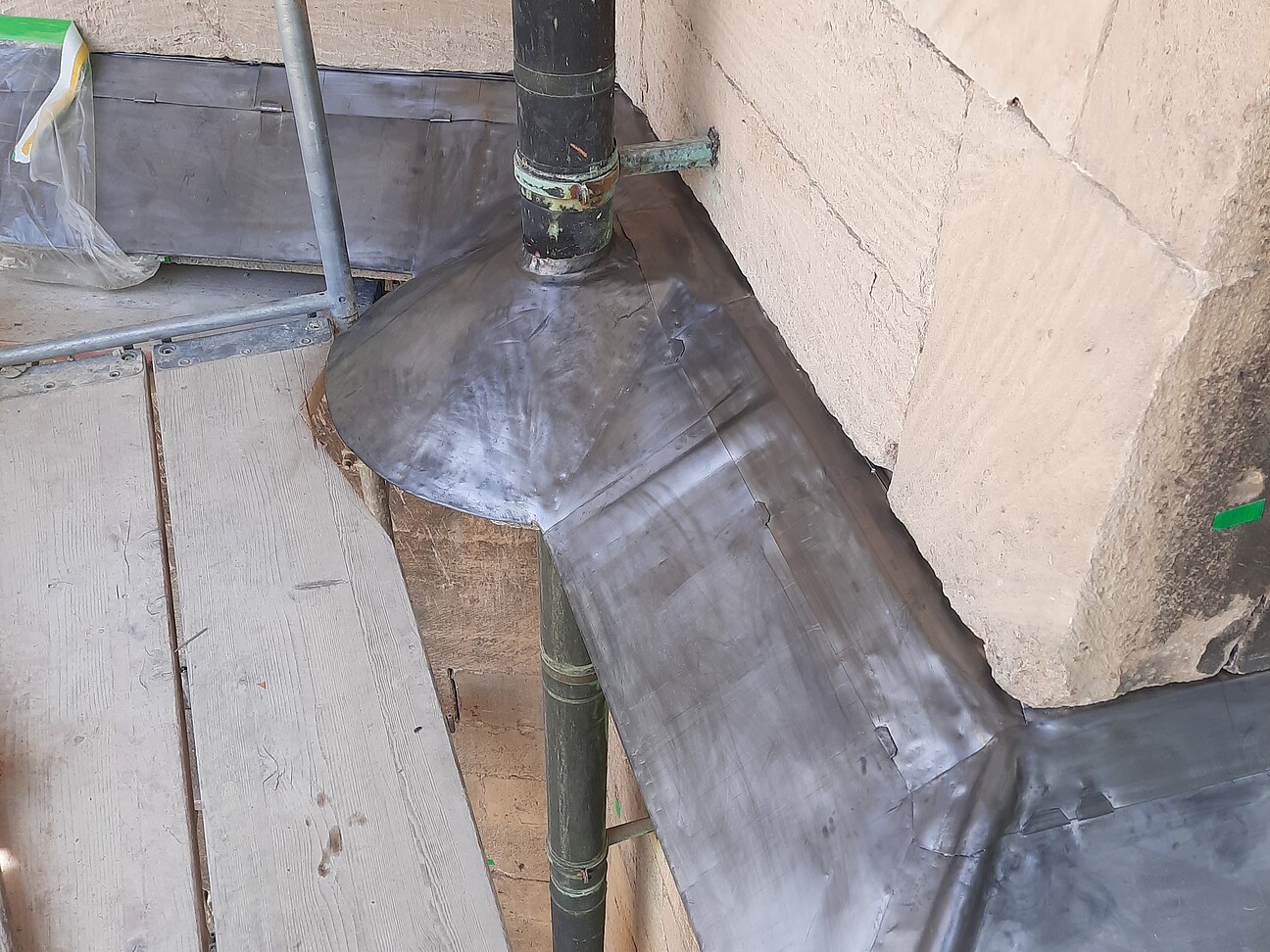 - Bauklempnerarbeiten: Anfertigung und Einbau neuer Abdeckungen aus Walzblei auf den Gurtgesimsen