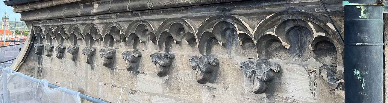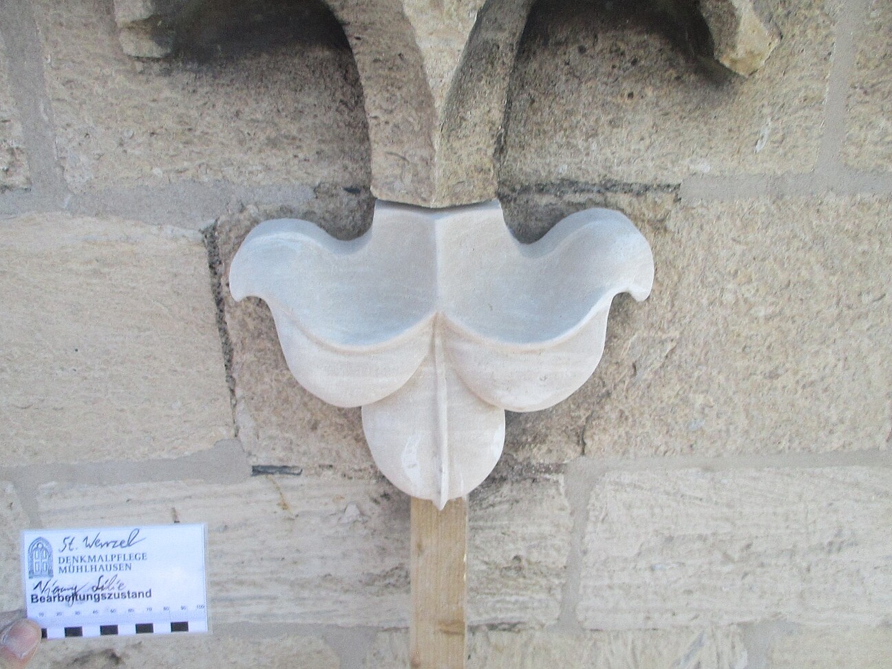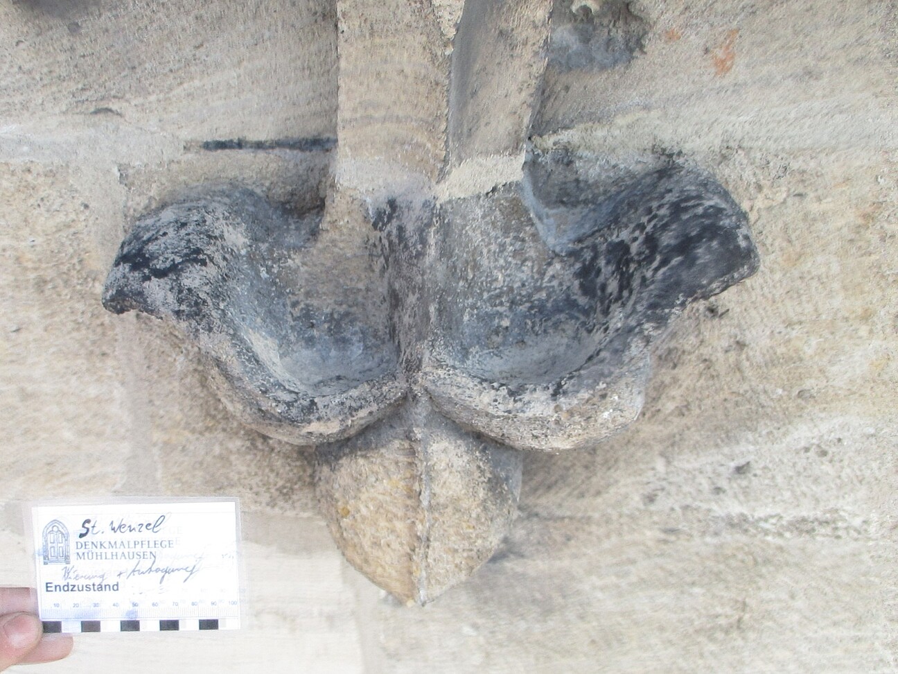 - Fehlstellenergänzungen: Schließen kleinerer Fehlstellen mit mineralischer Steinersatzmasse; Verschluss größerer Fehlstellen mit Vierungen; Einbau von Neuteilen (SAVONNIERES, Französischer Schaumkalk), tlw. mit Bildhauerelementen