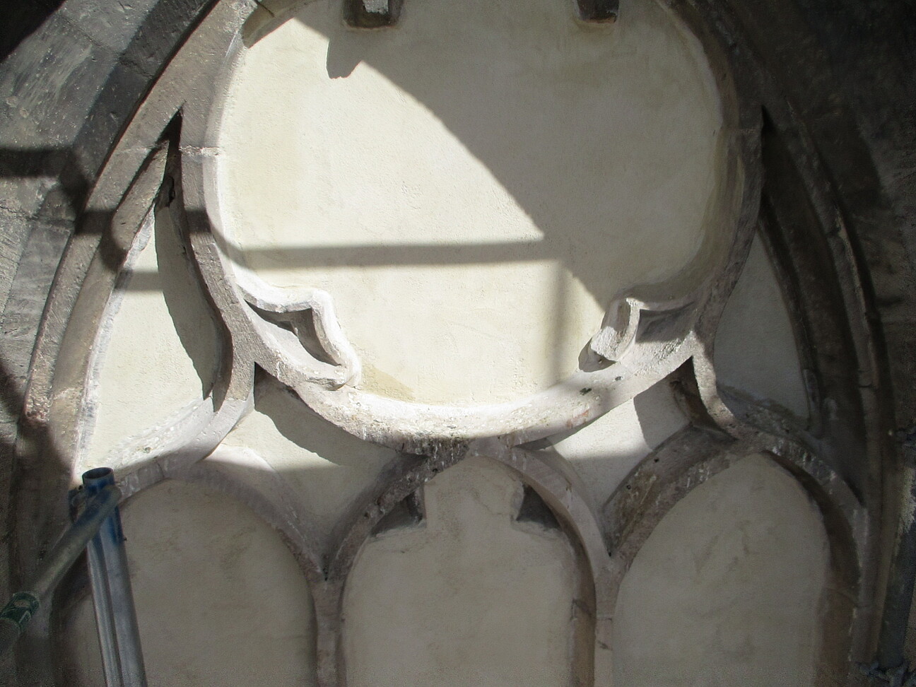 - Abnahme schadhafter Putzbereiche in einem zugesetzten Maßwerkfenster; Neuverputz mit Luftkalkputz