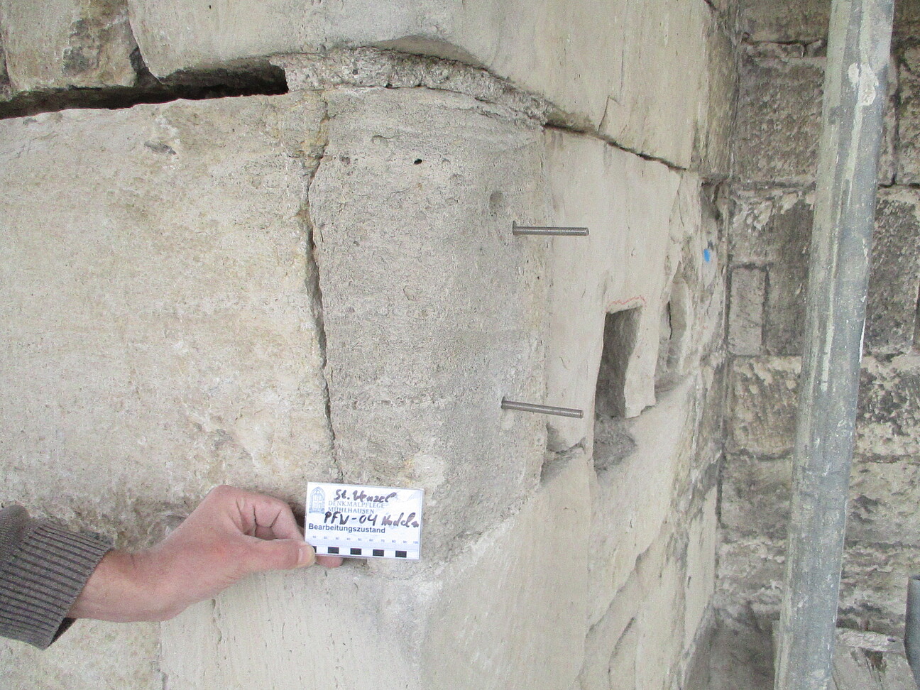- Statische Sicherung / Natursteinfestigung: Kleben & Sichern gebrochener Steine mit Ankernadeln; Festigung absandender Flächen mit KSE (Flutverfahren)