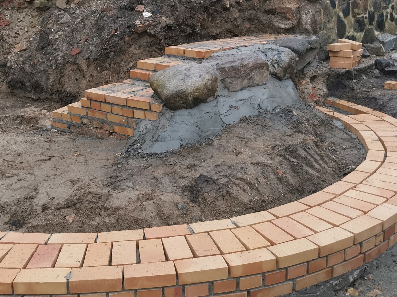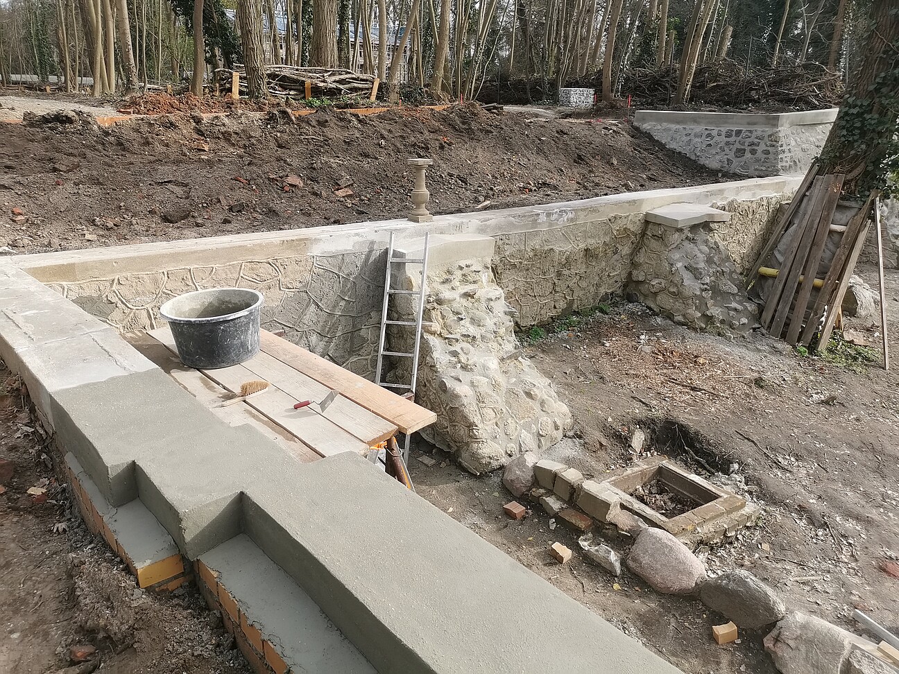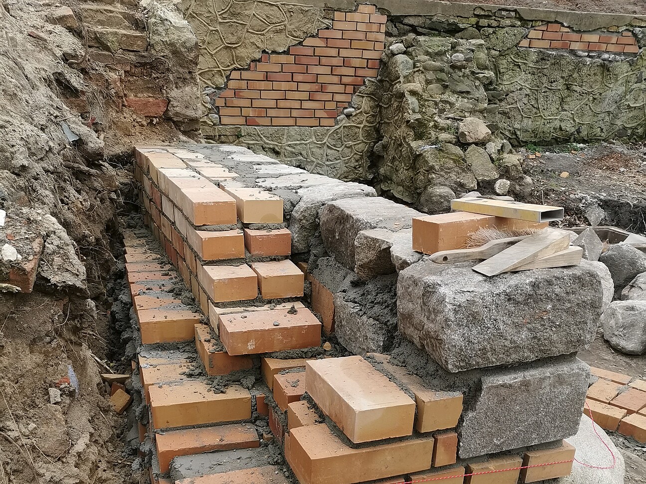- Herstellung von Streifenfundamenten und Wiederherstellung eines Stützmauerabschnitts als Ziegelmauerwerk