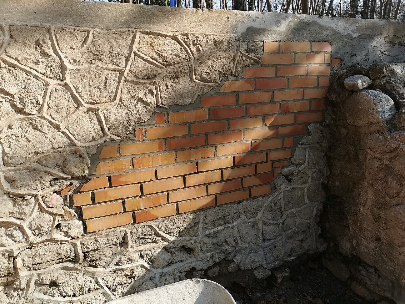 - Fehlstellenverschluss mit Feld-, Back- und Ziegelsteinen; Instandsetzung der Mauerabdeckungen mit Betonstein und anschließendem Verputz