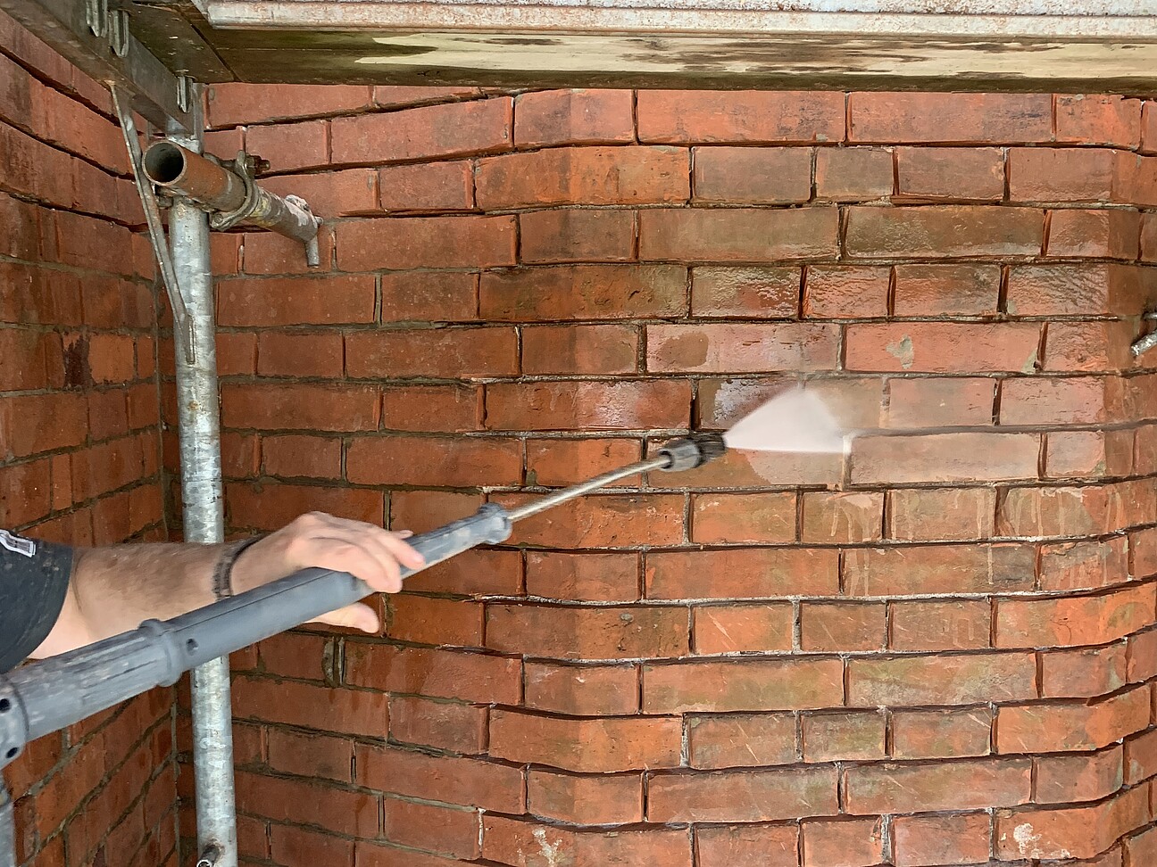 - Neuverfugung mit Rundkellenstrich (Ziegelmauerwerk); gleichzeitiger Verschluss kleinerer Ziegelausbrüche