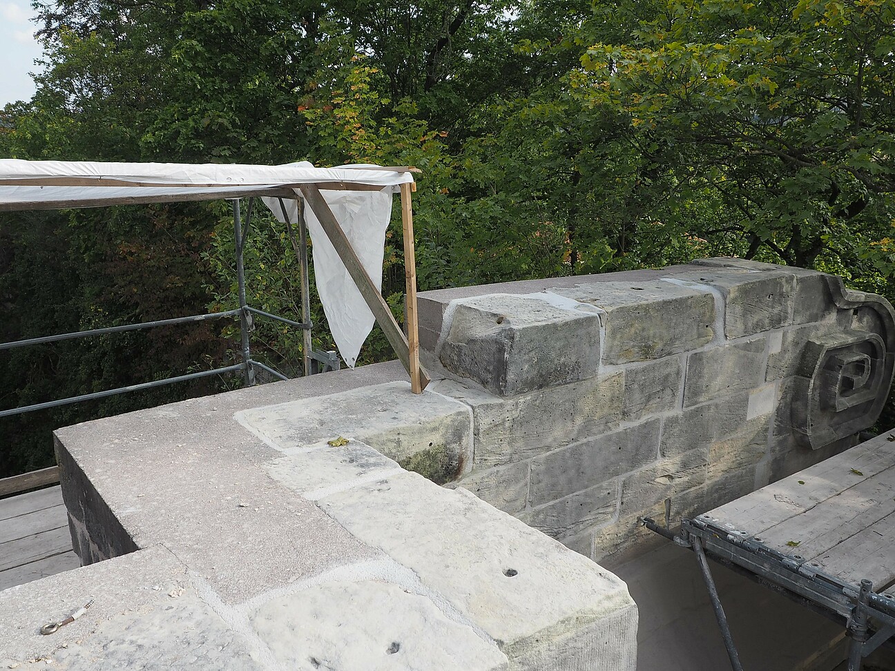 - umfassende Reinigung des Mauerwerks: tiefgehende Entfernung von Gehölzen und Pflanzen (v.a. Mauerkronenbereiche; partiell Steinausbau), Niederdruck-Pulverstrahlreinigung (Westfassade), HD-Reinigung, mechanische Feinreinigung; Entfernung verbauter Eisenteile