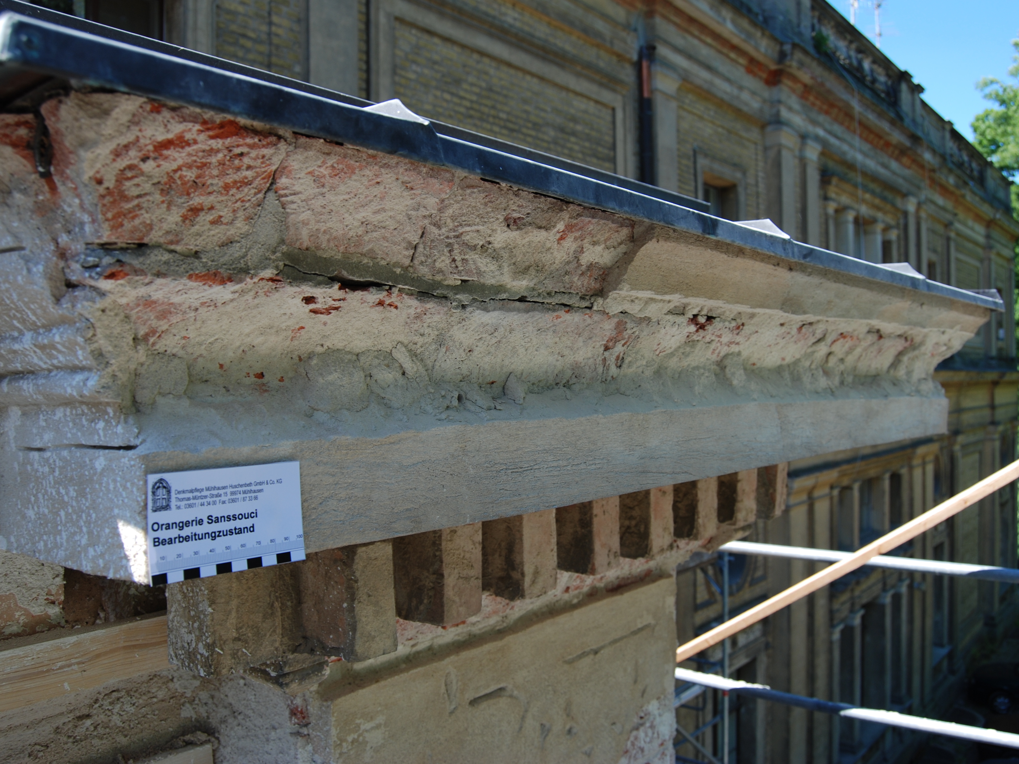 - Austausch stark beschädigter, einzelner Ziegel; Ziegelergänzungen mit, an den Bestand angepasstem Material