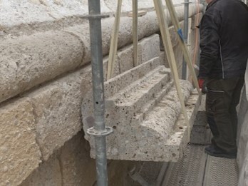 - Natursteinarbeiten: Einbau von Vierungen aus Nagelfluh, Anfertigung und Einbau neuer Werksteinteile