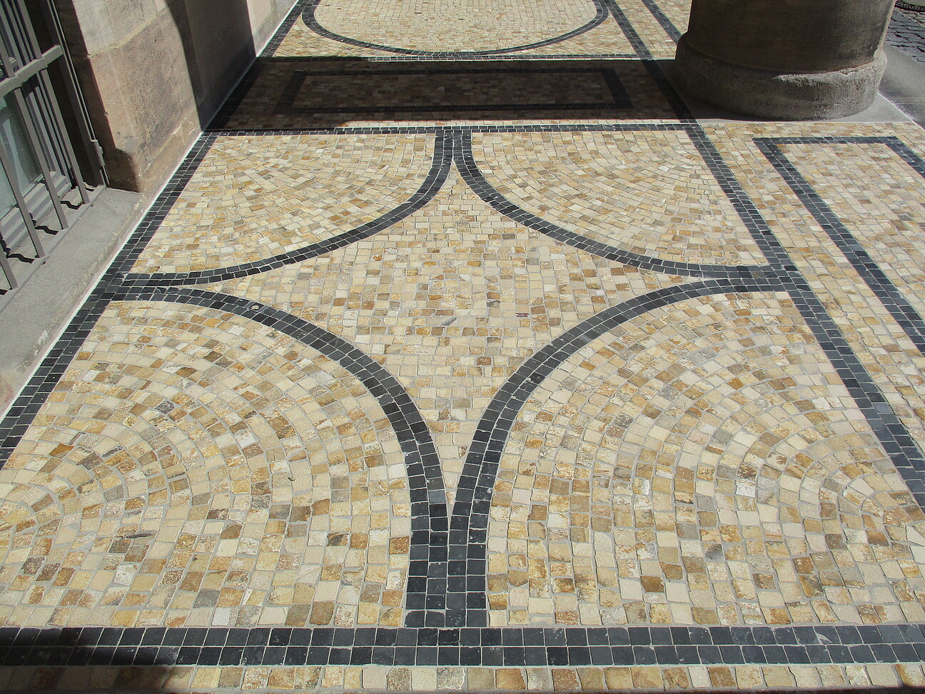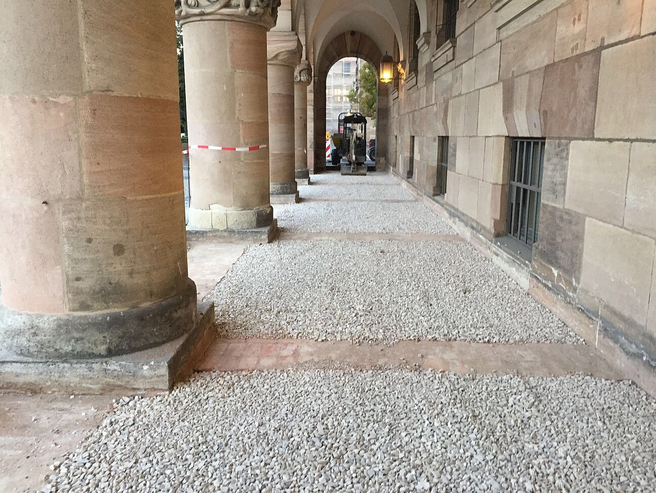 - Reinigung der Granitborte und Plinthen an Säulenbasen im Trockeneis- und Partikelstrahlverfahren, Abnahme von Altergänzungen und Verschluss von Fehlstellen mit Vierungen und Epoxidharzmörtel an Granitborte, tlw. Aufnahme und Neuversatz der Bortsteine, Aufbringung von Ausgleichmörtel für optimalen Wasserablauf